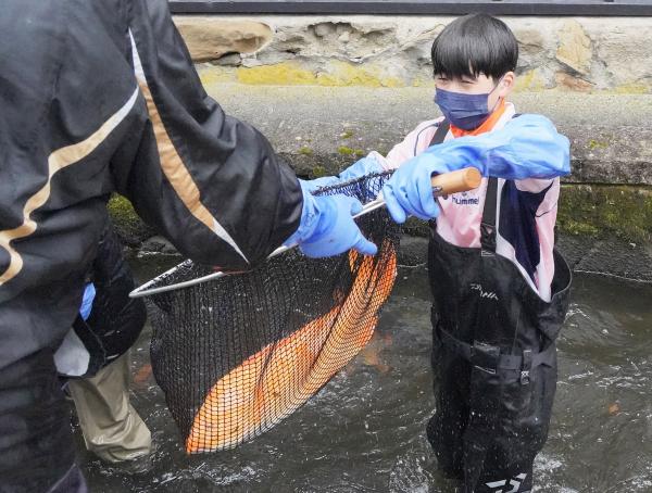 同協会の渡邉隆会長は「3年ぶりに子どもたちに参加してもらいました。瀬戸川の鯉は飛騨市のシンボルでもあり、直にさわって体験して、記憶に残してほしいです。鯉を愛でて飛騨市の良さを感じてもらい、卒業して他所へ行っても、いつか鯉のように大きくなって帰ってきてもらえたら」と目を細めていました。