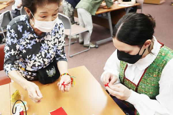 講座ではギェドレさんが国旗と同じ3色の毛糸を使って三つ編みのような組みひもの作り方を指導。完成すると、参加者はギェドレさんから使い方を教えてもらい、手首に付けたり、ヘアーバントにして楽しんでいました。一方、つるし飾りは正絹の端切れと綿、ビーズなどを使って「くくり花」の作り方を会員が指導。ギェドレさんも針と糸を手に真剣な眼差しで挑戦していました。