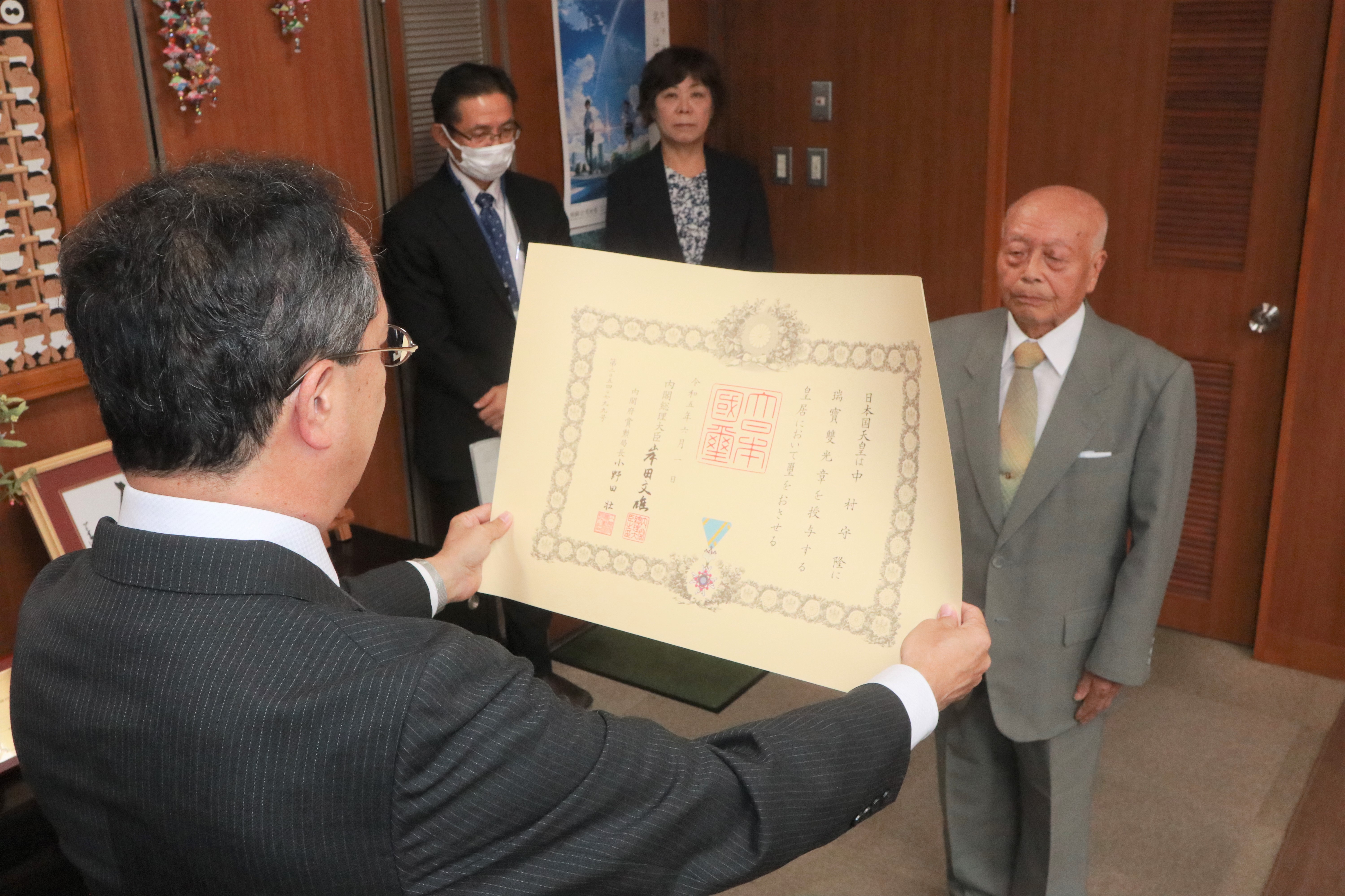 今年6月、内閣府は長年にわたり教育業務に従事され、教育の振興に多大な貢献を果たされた中村さんに瑞宝双光章を贈ることを決定。この日は受賞の伝達式が市役所で行われ、都竹市長が賞状を手渡しました。