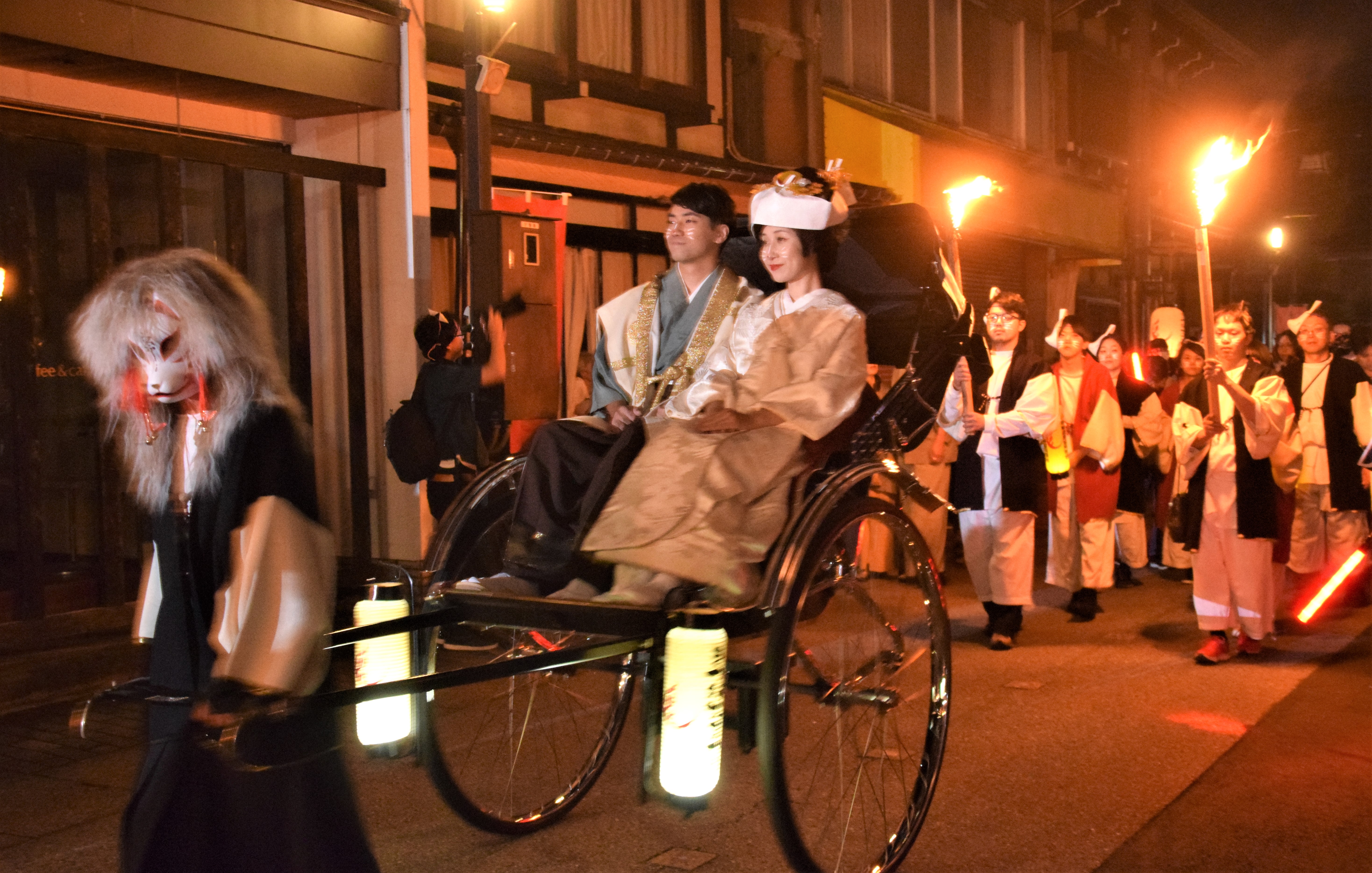古川の伝統行事「きつね火まつり」が4年ぶりに開かれ、約1万5千人の観光客らで賑わいました。町商工会青年部の皆さんが五穀豊穣や商売繁盛を願い、民話「きつねの嫁入り」を再現して創られた祭りです。花婿・花嫁役には実際に婚約したカップルが抜てきされるとあって、例年、大勢の観光客が見学に訪れます。