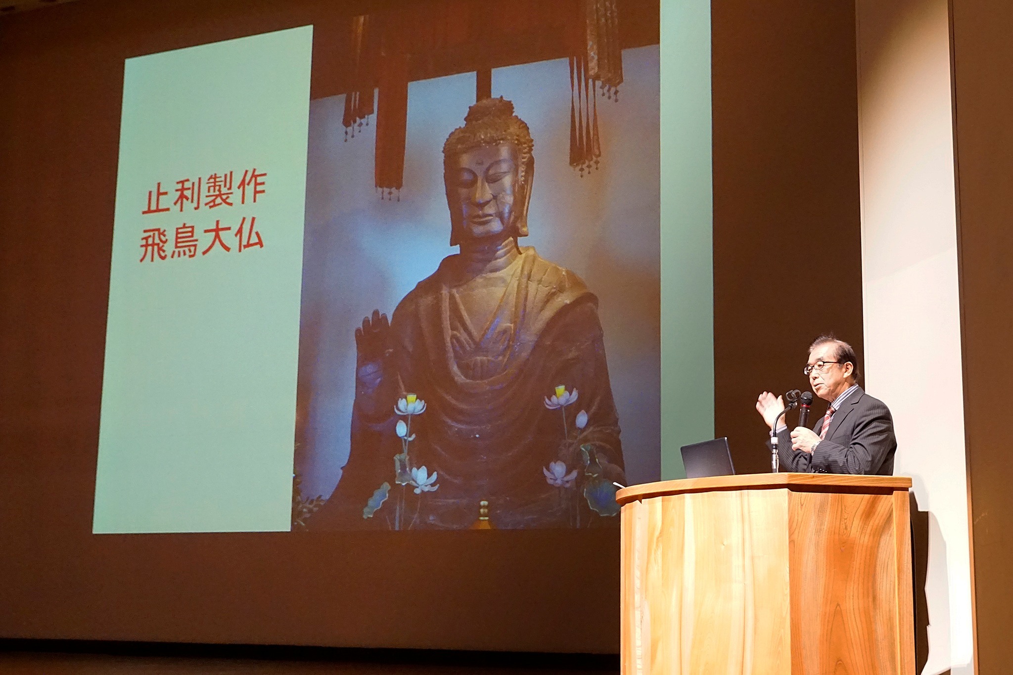 初日には、名古屋市立大学の小俣英彦准教授による「文化財複製を活用した文化の共有と継承―クローン文化財―」、飛騨・世界生活文化センター学芸アドバイザーの田中彰さんによる「止利仏師と奈良県ゆかりの地を訪ねて」の講演がありました。