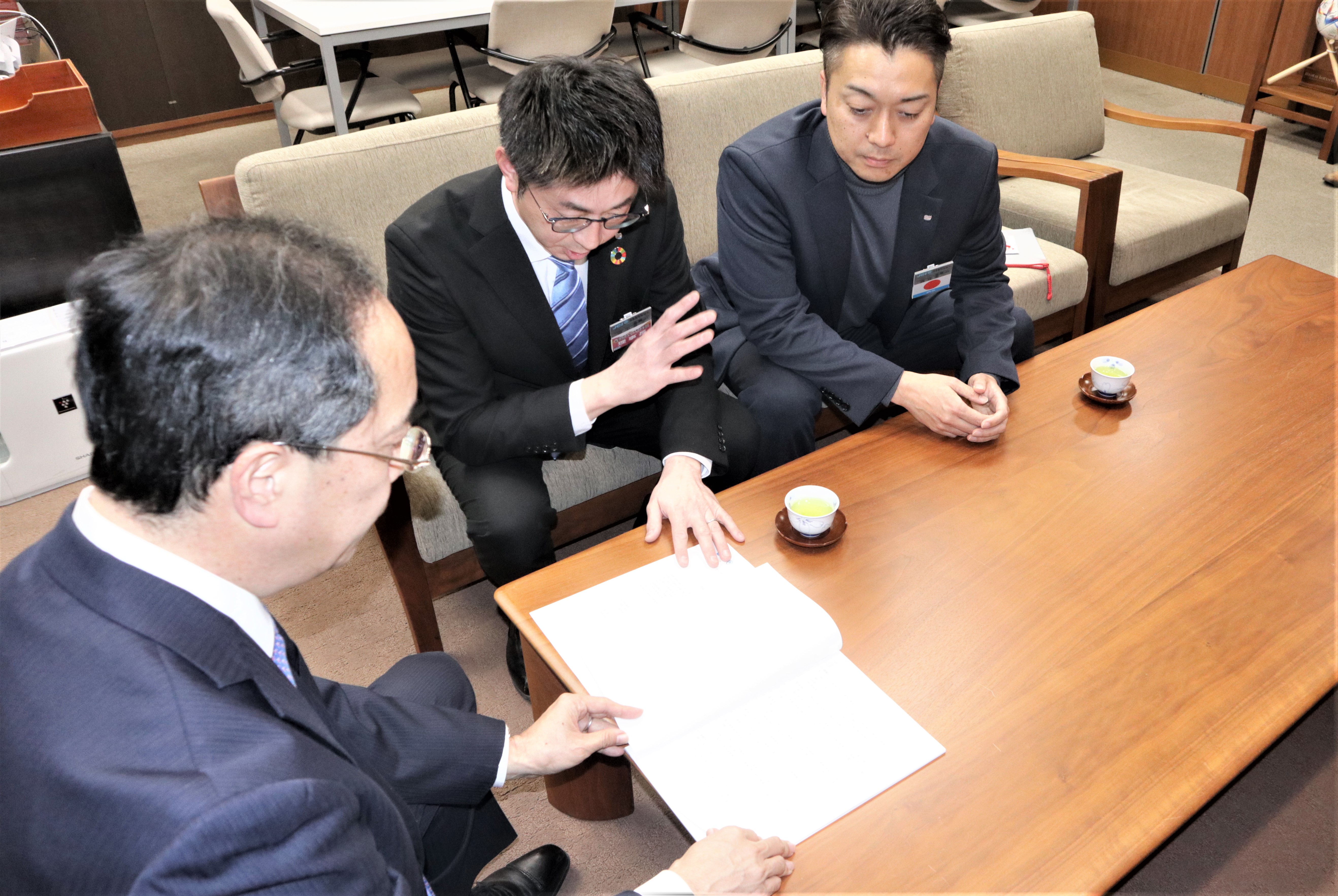 この日は同会議所から田中昌之理事長と齋藤憲一直前理事長が訪れ、都竹市長に寄付金を手渡した後、提言書を提出しました。田中理事長らは「大小いろいろな休憩スペースや夏場に楽しめる噴水、合唱祭やライブも開ける丸形ステージなどもあればもっと人気を呼び、多くの人が集まります。また民間の知恵もお借りすれば、たくさんの改善点が見つかり、より良い施設になると思います」などと話しました。