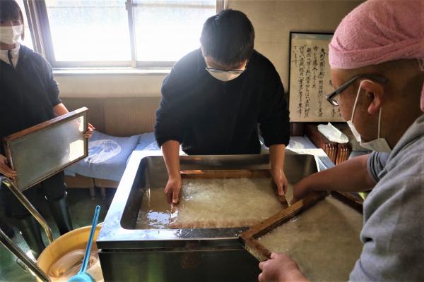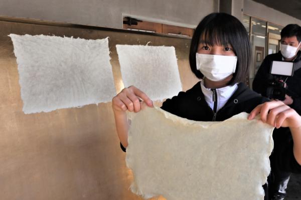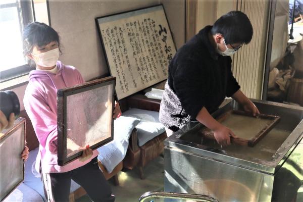 河合小は特産の山中和紙を使って毎年、卒業証書を制作しています。今年は卒業生8人が卒業式を前に河合町角川にある同館へ。児童らは紙漉き職人・柏木昭人さんに手本を見せてもらった後、コウゾやトロロアオイの液が入った水槽に簀桁(すげた)を入れたり出したりしながら紙すきに挑戦。漉き上げると機械で水分を飛ばし、紙が破れないよう注意深くはがして乾燥器に貼って乾かしました。