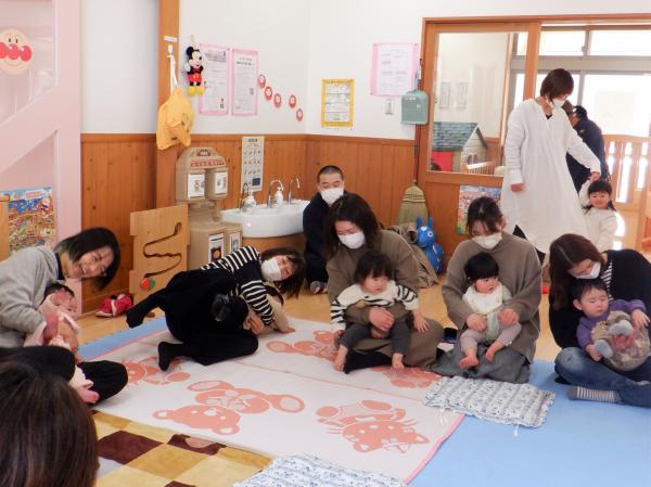 河合宮川子育て支援センターで「1年間子育て支援センターに遊びに来てくれてありがとう」という感謝の気持ちをこめてお楽しみ会が催され、23人の親子が参加しました。