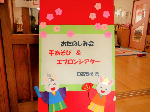 どじょっこ劇団としても活躍される田高智枝さんをゲストに迎え、参加親子と一緒に手遊びや、エプロンシアターを楽しみました。「だるまさんが」や「おちたおちた」等の手遊びでは、子どもたちが歓声を上げ、親子の笑顔が溢れていました。低年齢向けの「まる、さんかく、しかく」と「まいごのこねこちゃん」を演じていただいたエプロンシアターでは、親子で集中して見入っていました。