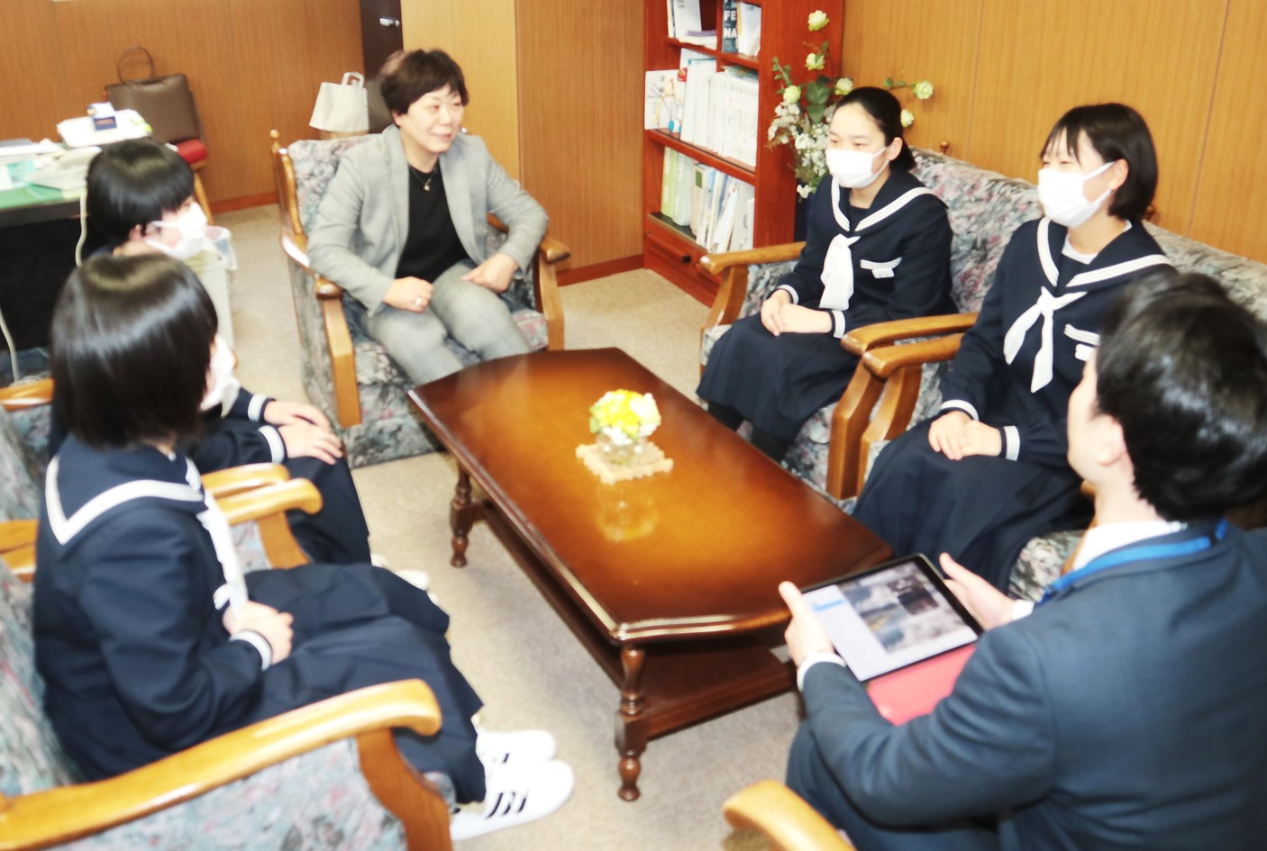 この日はメンバーのうち建村美羽さん、玉腰優羽さん、古田志織さん、星合小夏さんの4人と山崎さんらが市役所を訪れ、沖畑教育長を囲んで完成した動画の上映会を開きました。生徒たちは春の体育祭や秋の修学旅行、また、日ごろ授業で中学生たちが見せる素のままの表情など、この1年間に切り取った映像を眺めながら懇談しました。