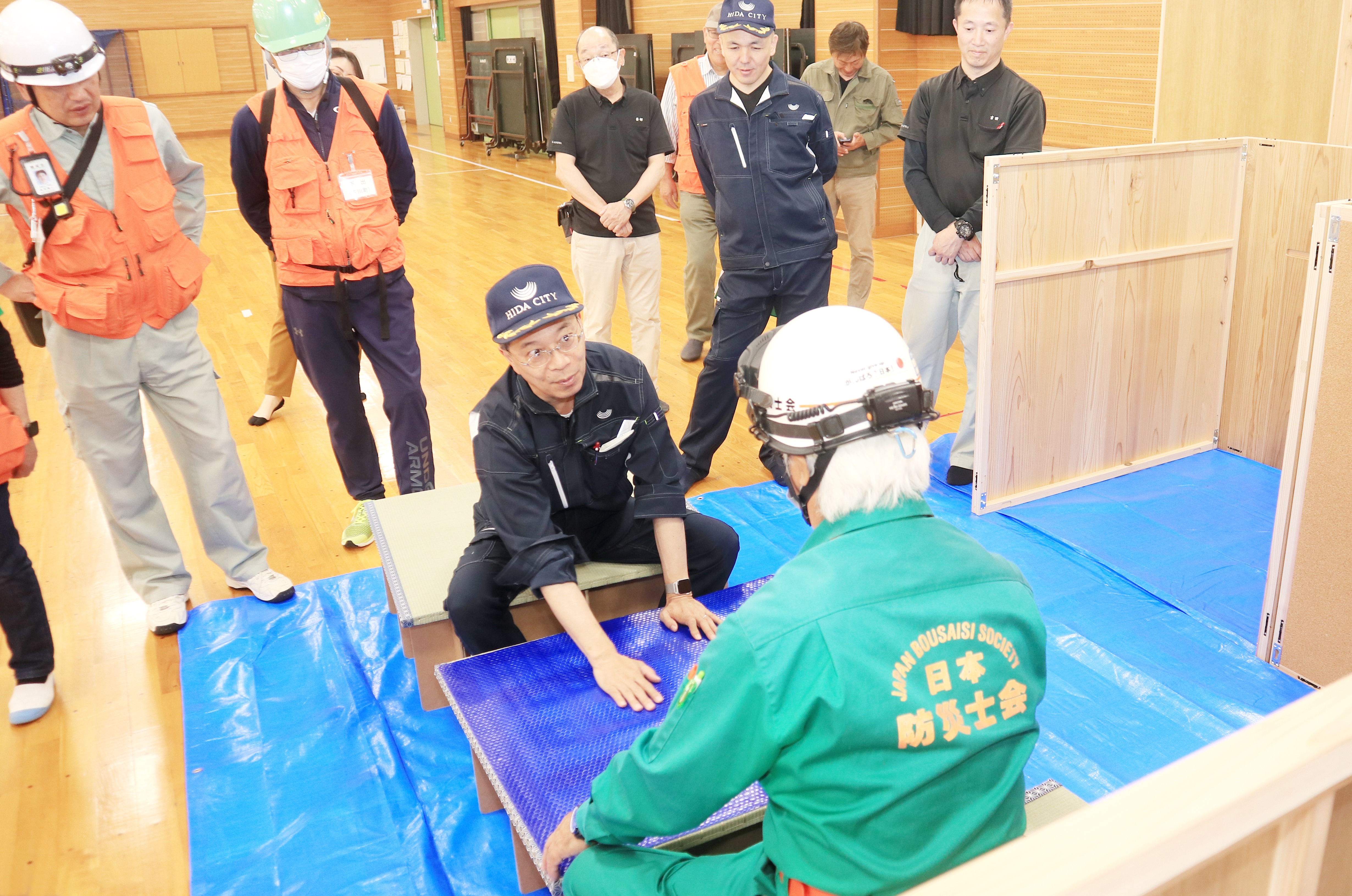 会場には、訓練の様子を視察に訪れていた清流の国ぎふ防災・減災支援センターのコーディネーター・岩井慶次さんも訪れ「防災用具を屋外へ取りに行くのは震災状況によって困難な場合もあります。間仕切りはスギ材なので温かみがあり、内装材として塗装もできます。3枚重ねで収納できるという工夫も見られ、よく考えられています」と評価しました。