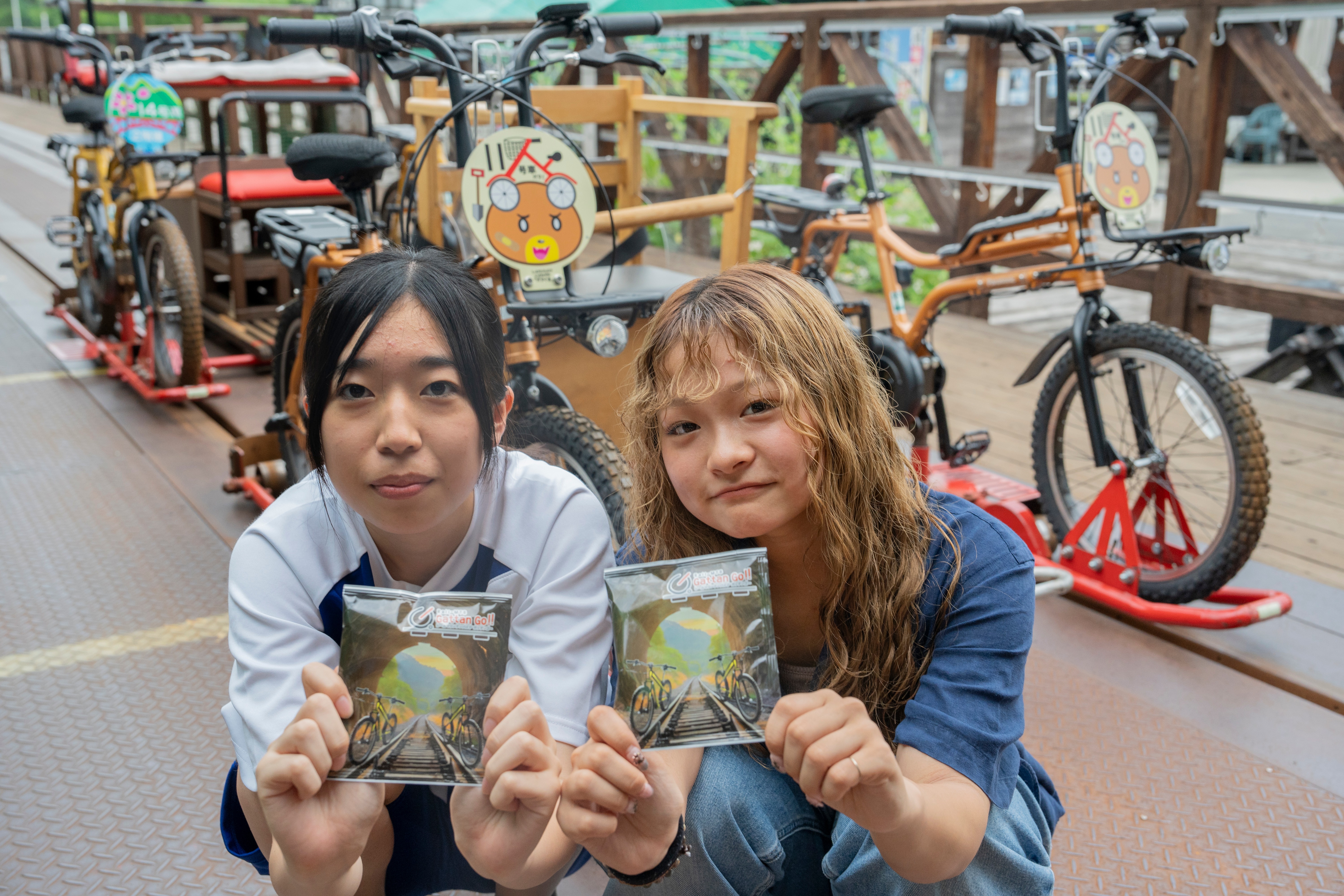 この日は、現在高校1年生の木元沙羽子さんと洞優莉彩さんが旧奥飛騨温泉口駅で、自分たちが発案した商品と初対面しました。パッケージは木元さんがデザインした原案を元にAIを活用しデザインを完成させました。