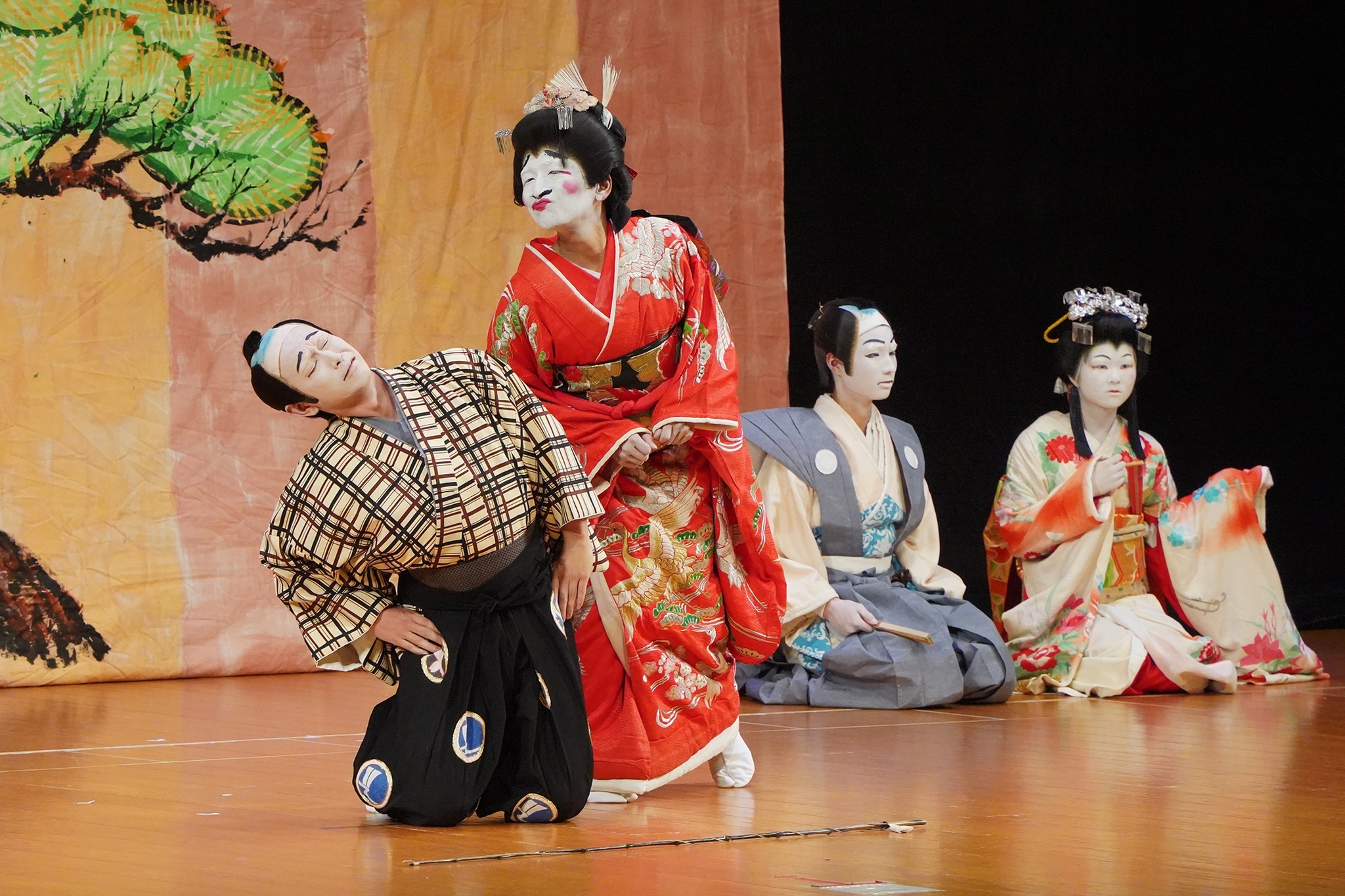 開会セレモニーでは、神岡江戸木遣保存会の皆さんが『木遣唄』を披露して催しに華を添えました。飛騨市河合町歌舞伎保存会の皆さんは、盗賊5人が勢ぞろいして名乗りをあげて見得を切る場面でよく知られる『白波五人男~稲瀬川勢揃いの場』と、恵比寿様のお告げによって釣り竿で美女を釣りあげた大名にあやかろうと同じ釣り竿で挑戦した太郎冠者が醜女を釣り上げてしまうコミカルな『戎詣恋釣針 釣女』を熱演。会場からは盛んに拍手が送られました。
