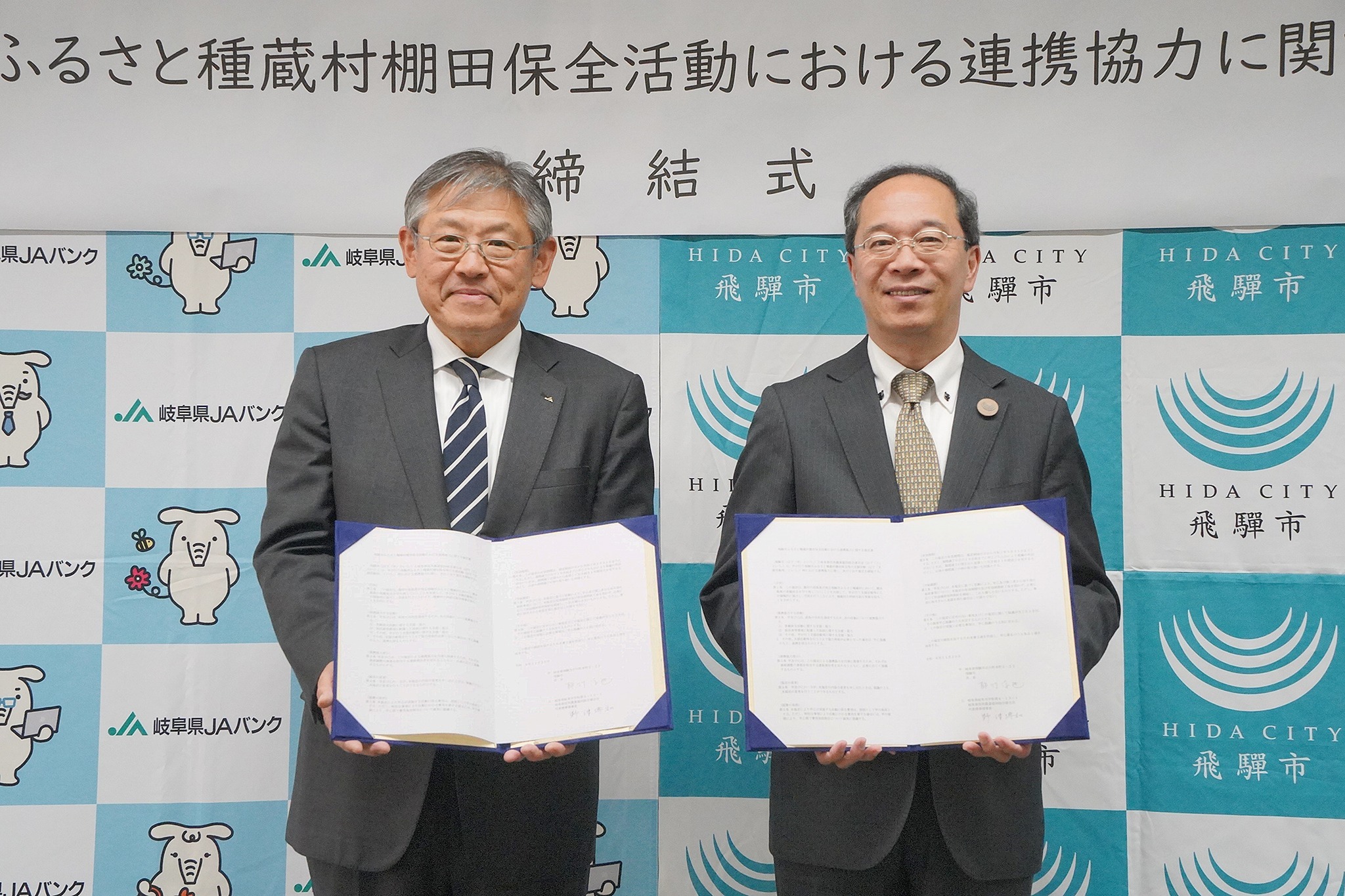 岐阜県信用農業協同組合連合会と飛騨市が、宮川町種蔵地区の棚田のある景観を守る取り組みについて「飛騨市ふるさと種蔵村棚田保全活動における連携協力に関する協定」を締結しました。