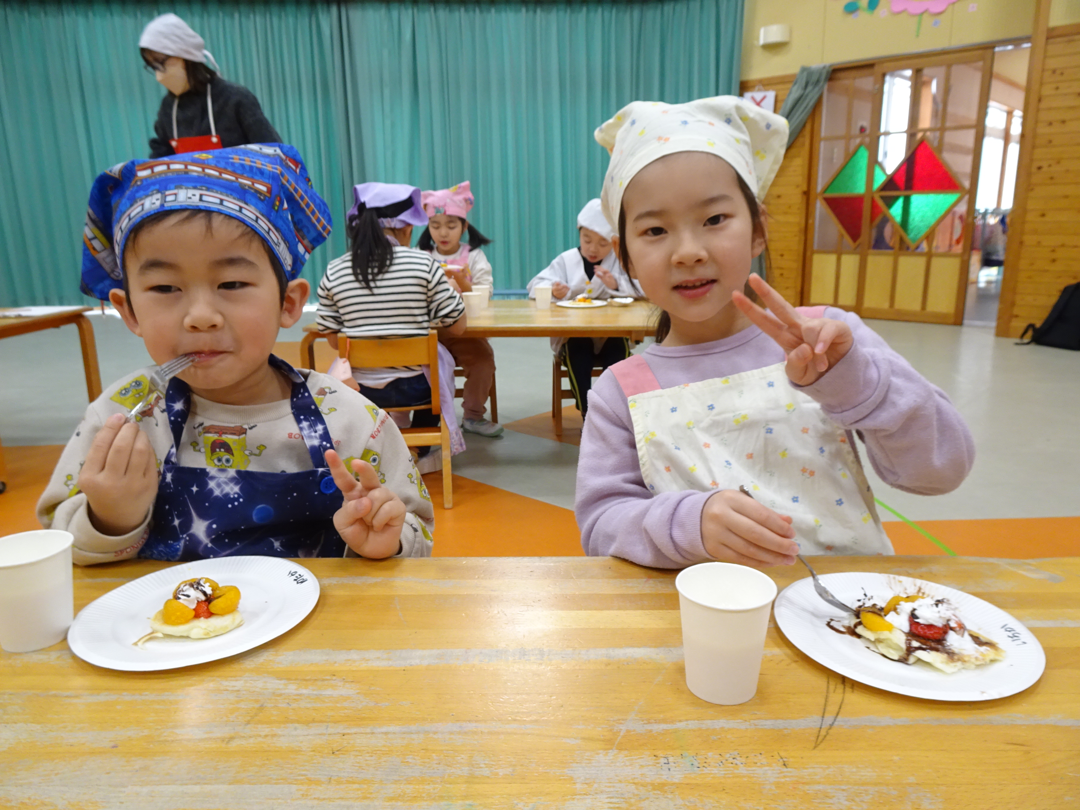 調理では、ホットケーキミックスに牛乳とレモン果汁を加えてよく混ぜ合わせ、ホットプレートでパンケーキを1人1枚焼きました。みかんやいちご、ホイップクリームなども各児でトッピングしました。試食時には、レモン果汁やはちみつ、牛乳を混ぜて作ったレモンラッシーも一緒に味わい、子どもたちは満足しながら食べました。