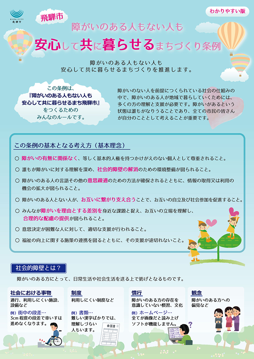 市民の皆さんに障がいや障がいのある人に対しての理解を深めていただき、「障がいのある人もない人も安心して共に暮らせるまちづくり」を進めるためにそのルールとなる条例 [PDFファイル/344KB]を制定しました。